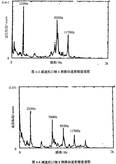 圖4-3、4-4分別是把振動加速度計放在減速機I軸A側和B側軸承座上所測得振動速度幅值譜圖;圖4-5、4-6分別是把振動加速度計放在減速機II軸A側和III軸B側軸承座上所測得振動速度幅值譜圖;圖4-7、4-8分別是把振動加速度計放在減速機IV軸A側和B側軸承座上所測得振動速度幅值譜圖。