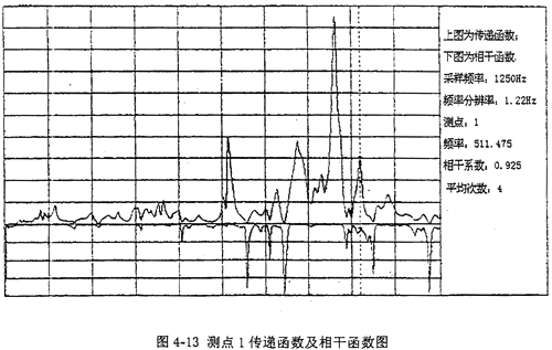 圖4-13是測點1垂直方向的傳遞函數(shù)及相干函數(shù)圖,其它點的傳遞函數(shù)圖由于篇幅關系省略。