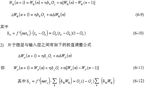對于圖6-1所示的網(wǎng)絡(luò),其訓練學習的過程包括:1)網(wǎng)絡(luò)內(nèi)部的前向計算;2)誤差的反向傳播。其主要目的就是通過逐步調(diào)整網(wǎng)絡(luò)的內(nèi)部連接權(quán)值,使網(wǎng)絡(luò)的均方誤差達到我們的要求。網(wǎng)絡(luò)內(nèi)部的連接權(quán)值的調(diào)整,都是采用推廣的δ規(guī)則來完成的。