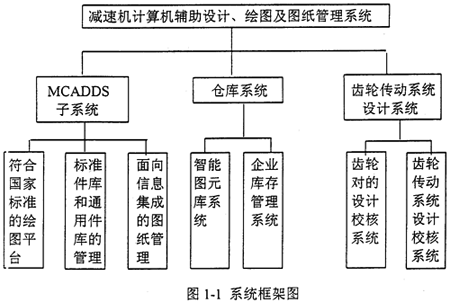 減速機計算機輔助設計、繪圖及圖紙管理系統(tǒng)主要包括MCADDS子系統(tǒng)和齒輪傳動系統(tǒng)的設計系統(tǒng)和信息管理系統(tǒng)三部分(見圖1-1),其中MCADDS子系統(tǒng)實現(xiàn)高效繪圖;齒輪傳動系統(tǒng)的設計系統(tǒng)快速精確的實現(xiàn)產(chǎn)品設計;而信息管理系統(tǒng)將提高企業(yè)的信息管理與控制,提高資源利用率。