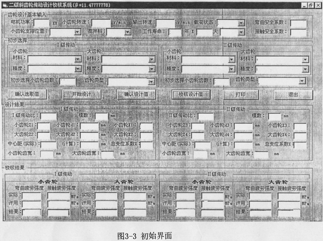 在這三類參數(shù)中,用戶參數(shù)是要由用戶給定,齒輪特性參數(shù)是要得到的結果,齒輪設計參數(shù)是一種中間描述參數(shù),它需要通過一系列的復雜的計算求解,而齒輪設計的科學性也就是通過對齒輪設計參數(shù)的精確確定而實現(xiàn)的,具體計算機實現(xiàn)公式見3.6-3.8;齒輪的接觸強度與彎曲強度校核分別見3.3和3.4。系統(tǒng)的參數(shù)初始輸入界面見圖3-3。