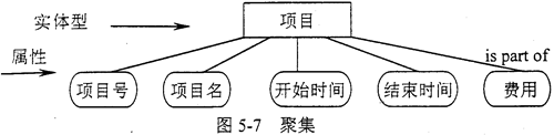 2、聚集(Aggregation):定義某一類型的組成部分。她抽象了對象內(nèi)部類型和成分之間“is part of”的語義。在E-R模型中若干屬性的聚集組成了實體型,就這種抽象。如圖5-7。
