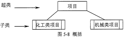 3、概括(Generalization):定義類型之間的一種子集聯(lián)系。它抽象了類型之間的“is subset of”的語義。例如項目是個實體型,機械類項目也是實體型,化工類項目也是實體型。機械類項目、化工類項目均是項目的子集。我們把項目稱為超類(Superclass),將機械類項目、化工類項目成為項目的子類(Subclass),見圖5-8。