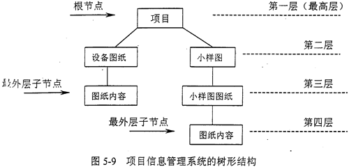 對于項目信息管理系統(tǒng),有自己的特殊性,從邏輯結(jié)構(gòu)上說,他是一個典型的樹型結(jié)構(gòu),每個節(jié)點除根節(jié)點外,有自己的子節(jié)點;每個節(jié)點除最外層子節(jié)點外,有自己的父節(jié)點。在本系統(tǒng)中,項目是整個樹結(jié)構(gòu)的根節(jié)點,而個圖紙內(nèi)容是最外層子節(jié)點,項目是設(shè)備圖紙和小樣圖的父節(jié)點,圖紙、小樣圖又是圖紙內(nèi)容的父節(jié)點,見圖5-9。