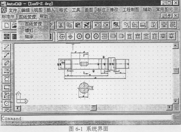 減速機計算機輔助設計、繪圖及圖紙管理系統(tǒng)主要包括MCADDS子系統(tǒng)和減速機CAD子系統(tǒng)二大部分,MCADDS系統(tǒng)是一個相對通用的圖形設計與圖紙管理系統(tǒng),適用于各種機械產品,包括符合國家標準的繪圖平臺、基于事物特性表的通標件庫和面向信息集成的圖紙管理等三個模塊;減速機CAD系統(tǒng)是針對減速機的設計計算開發(fā)的,對零部件具有通用性,包括齒輪嚙合校核、齒輪傳動系統(tǒng)的設計與校核。圖6-1為MCADDS系統(tǒng)界面。該系統(tǒng)的主要內容如下: