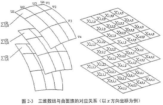 若已知曲面Σ1由一系列離散的坐標(biāo)值表示,則規(guī)則化后的坐標(biāo)值系列可以寫成二維數(shù)組成的形式,二維數(shù)組中的各維分別對應(yīng)u,v參變量或方向,二維數(shù)組中的各元素分別對應(yīng)曲面上節(jié)點的坐標(biāo);那么,曲面Σ1在坐標(biāo)S2中運(yùn)動形成的曲面族{Σ1}可以用三維數(shù)組表示,三維數(shù)組的各維分別對應(yīng)u,v,t參變量或方向,并且曲面族中的各點與此三維數(shù)組的各個元素在空間結(jié)構(gòu)上是——對應(yīng)的,如圖2-3所示。