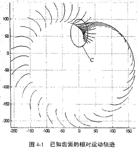 在已知齒輪齒面一個周期的相對運動所留下的運動軌跡中,我們可以看出,在區(qū)域C中出現(xiàn)了一個清晰的包絡面,它就是所求的未知齒面,即兩齒面在C區(qū)嚙合,稱C區(qū)為嚙合區(qū),而在C區(qū)之外,也會出現(xiàn)包絡,但那只是幾何意義上的共軛點,不產(chǎn)生真正意義上的嚙合傳動;已知齒面在嚙合區(qū)域與非嚙合區(qū)域有較清晰的界限;在嚙合區(qū)域,已知曲面與所求齒面的共軛關(guān)系是簡單的,無論是否會出現(xiàn)二次接觸,這一區(qū)域的共軛曲面都可以用數(shù)字化共軛曲面求解方法求出。