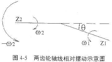 設(shè)兩齒輪的軸線分別為z1,z2,與之固連的坐標系分別為S1,S2,轉(zhuǎn)動角速度分別為ω1,ω2,兩軸線交角為θ,F(xiàn)暫不考慮兩齒輪的嚙合運動,只考察兩齒輪的相對擺動,為使z2固定不動,可假設(shè)給系統(tǒng)添加一個繞z2軸且與ω2大小相同、方向相反的運動,如圖4-5所示。則與齒輪固連的坐標系S1相對于S2的運動可以描述為繞z1軸的自轉(zhuǎn)與繞z2軸的公轉(zhuǎn)。