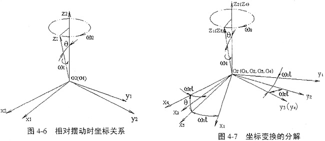 把以上的相對擺動具體化,考慮兩坐標系的變換,在靜坐標系S2中觀察,整個S1坐標系只有2個自由度,即S1分別繞z1軸的自轉(zhuǎn)和繞z2軸的公轉(zhuǎn)。在交角不變的情況下兩坐標系的關(guān)系可用圖4-6表示。
