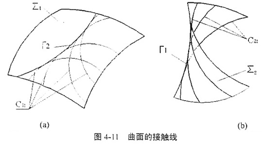 無論是已知曲面上的C1t還是共軛曲面上的C2t,當t取不同的值時,就得到不同位置的曲線,也就是說,{C1t}、{C2t}是以t為參數(shù)的曲線族,那么在曲面Σ1或Σ2上就可能存在曲線族{C1t}、{C2t}的包絡線。在已知曲面Σ1上,如果曲面族{C1t}存在包絡,那么以包絡線為界可以把Σ1分成兩部分(如圖4-11a所示),一部分布滿了接觸線C1t,一部分則沒有,這條包絡線Γ2稱為二界包絡曲線,其上的各點稱為二類界限點,也稱為嚙合界限點;對于共軛曲面Σ2,因為Σ2全部是由{C2t}組成的,所以如果曲線族{C2t}的包絡存在,則此包絡也就是曲面Σ2的脊線(如圖4-11b所示),這條包絡線Γ1稱為一界包絡曲線,其上的各點稱為一類界限點,也稱為根切界限點或曲率干涉界限點。嚙合界限點可用于判斷已知曲面上有效的嚙合區(qū)域,根切界限點可用于避免共軛曲面的根切,這兩類界限點對于共軛曲面的求解有著重要的意義,同時也是評價共軛運動質(zhì)量的重要指標之一。