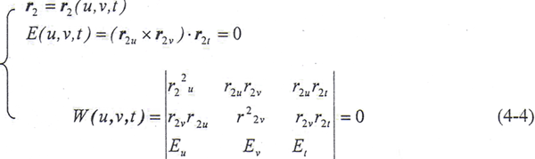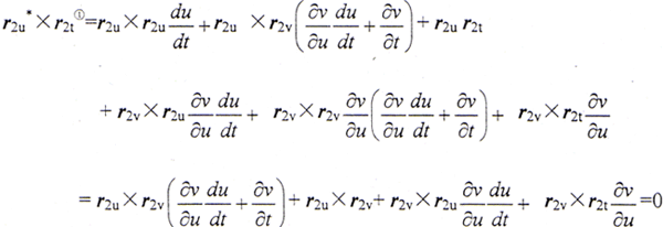 為了使上述向量方程變?yōu)闃肆糠匠蹋沟仁絻啥它c積以r2u×r2v(≠0),并按拉格朗日恒等式展開,整理后得