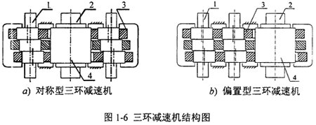 由于三環(huán)減速機(jī)的研究歷史較短,作為一種新生事物,它的發(fā)展道路也必定是曲折的。我國(guó)生產(chǎn)的三環(huán)減速機(jī)的結(jié)構(gòu)如圖1-6所示,a)是對(duì)稱型三環(huán)減速機(jī),b)是偏置型三環(huán)減速機(jī),三環(huán)減速機(jī)由兩根高速偏心輸入軸1,低速輸出軸2,三片為齒環(huán)板3和外齒輪4構(gòu)成。三片內(nèi)齒環(huán)板3偏心安裝在兩根高速軸1上,它們都與外齒輪4相嚙合,外齒輪4安裝在輸出軸上,各軸均平行配置,利用三相并列平行雙曲柄機(jī)構(gòu)來(lái)克服死點(diǎn)。雙曲柄機(jī)構(gòu)的最大缺點(diǎn)就是存在死點(diǎn)位置,即當(dāng)曲柄與連桿共線時(shí),機(jī)構(gòu)處于運(yùn)動(dòng)不確定位置,此時(shí)傳動(dòng)角為零,機(jī)構(gòu)無(wú)法運(yùn)動(dòng),因此必須采取雙曲柄軸動(dòng)力輸入、多相并列雙曲柄機(jī)構(gòu)和多曲柄機(jī)構(gòu)來(lái)克服死點(diǎn)。