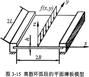 彈性力學(xué)是固體力學(xué)的一個分枝,主要研究物體(彈性體)由于受外力作用或溫度改變以及支座沉陷等原因而產(chǎn)生的應(yīng)力、形變和位移,彈性力學(xué)對彈性體作較精確的分析。對于本文的離散均載環(huán)弧段,環(huán)弧段的厚度h<<它的長度2L(或?qū)挾?B),且撓度較小,可以利用彈性力學(xué)中薄板的小撓度變曲理論,將均載環(huán)結(jié)構(gòu)參數(shù)與剛度聯(lián)系起來,通過正確處理邊界條件來改善計算結(jié)果。離散環(huán)弧段的計算模型如圖3-15所示,假定環(huán)弧段的支承邊界條件為兩端固支。