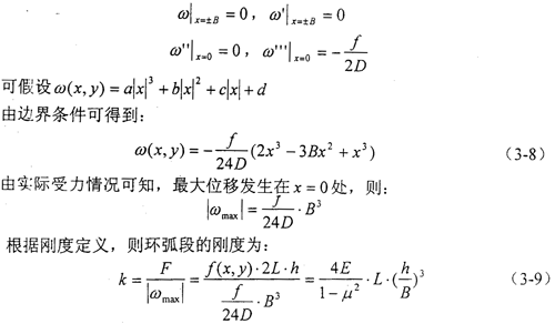 上式為兩端固支的環(huán)弧段剛度的計算公式,如將支承邊界條件改為一端簡支和一端固支或兩端簡支,則相應(yīng)的環(huán)弧段剛度為兩端固支剛度75%或50%。由式(3-8)可知,彈性均載環(huán)的厚度對其剛度的影響最大;在彈性均載環(huán)平均直徑一定時,凸臺尺寸及承載寬度對其剛度有一定影響。
