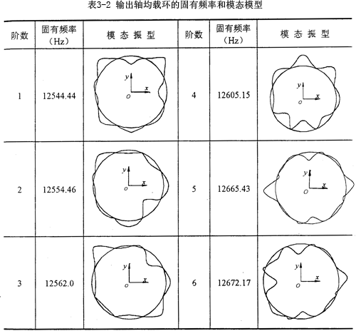 本文利用I-DEAS軟件來進(jìn)行彈性均載環(huán)的動力學(xué)分析。首先求解均載環(huán)的固有特性問題,在圖3-14所示的均載環(huán)的力學(xué)模型中,均載環(huán)的邊界條件取為均載環(huán)的八個外凸臺固支,輸出軸均載環(huán)和輸入軸均載環(huán)的有限元模型參數(shù)同3.5.3,中研究的一致。應(yīng)用Model草藥Solution模塊中的Model response部分,選用Normal Mode Dynalnics-SVI(普通模態(tài)動力分析——同步矢量迭代法)方法求得輸出軸均載環(huán)和輸入軸均載環(huán)的前六階固有頻率和模態(tài)振型分別如表3-2、3-3所示。