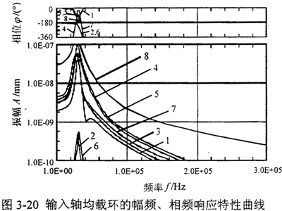 取輸入軸均載環(huán)的八個內(nèi)凸臺的中間點(diǎn)作為振動響應(yīng)點(diǎn),示意圖同圖3-18所示。取輸入軸均載環(huán)系統(tǒng)粘性阻尼系數(shù)c=0.03,均載環(huán)的邊界條件取為均載環(huán)的八個外凸臺固支,輸出軸均載環(huán)和輸入軸均載環(huán)的有限元模型參數(shù)同3.5.3中研究的一致。于是應(yīng)用I-DEAS分析軟件Model Solution模塊中的Model Response部分,可以求得輸入軸均載環(huán)的暫態(tài)激勵幅頻、相頻響應(yīng)特性曲線如圖3-20所示。