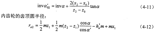 變位系數(shù)的確定是少齒差內(nèi)嚙合傳動(dòng)設(shè)計(jì)的關(guān)鍵。文獻(xiàn)中所述的內(nèi)、外齒輪都按滾齒加工的計(jì)算公式推導(dǎo)出的變位系數(shù)的迭代公式,與內(nèi)齒輪插齒、外齒輪滾齒的實(shí)際加工情況不一致,雖然能夠保證給定的重合度和齒廓不重迭干涉系數(shù)的要求,但是不能保證標(biāo)準(zhǔn)頂隙,而且一般得出的嚙合角也比較大。本章推導(dǎo)了少齒差內(nèi)嚙合傳動(dòng)實(shí)際加工情況的變位系數(shù)的迭代公式,解決了上述問(wèn)題。