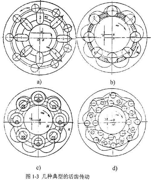 活齒傳動,全稱為“活齒少齒差行星齒輪傳動”,是一種由K-H-V 型少齒差行星齒輪傳動演化而成的一種新型齒輪傳動。它的特點是固定輪上的齒形制成圓弧或其他曲線,行星輪上的各輪齒改用單個的活動構(gòu)件(如滾柱)代替,而這些構(gòu)件分別置于輸出軸上沿周向分布的槽孔中,當(dāng)主動偏心構(gòu)件(波發(fā)生器)驅(qū)動時,它們將在槽孔中活動,故稱為“活齒”。常見的活齒傳動分為推桿活齒傳動(圖1-3a)、滾柱(鋼球)活齒傳動(圖1-3b)、套筒活齒傳動(圖1-3c)、擺動活齒傳動(圖1-3d)等;铨X結(jié)構(gòu)形式最初是由德國人于30 年代提出的,40 年代德國將活齒傳動技術(shù)應(yīng)用于汽車的轉(zhuǎn)向機構(gòu)中。60 年代前后,美國、前蘇聯(lián)、英國、聯(lián)邦德國等國都先后開展了研究工作。前蘇聯(lián)研究了“柱塞傳動”(活齒傳動的一種型式),提出了它的運動分析和力分析的計算方法。美國學(xué)者提出了推桿活齒減速器傳動裝置,分析了傳動原理,對傳動比和作用力進(jìn)行了計算,分析了其傳動性能。英國推出了“滑齒減速器”。80年代,前蘇聯(lián)學(xué)者HLHATHIIIeB.P.M推出了另一種活齒傳動形式即“正旋滾珠傳動”,并研究了正旋滾珠活齒傳動的嚙合理論、強度特性、走和性能等。前蘇聯(lián)還將正旋滾珠減速器用于石油鉆探中,成功地解決了渦輪鉆具轉(zhuǎn)速過高的難題。英國也曾對活齒傳動減速器進(jìn)行了系列生產(chǎn),單給傳動的傳動比為20~80,效率為86%~87%,也有雙級和三級傳動,功率N<25馬力。80年代才真正開始的,1986年北京航空學(xué)院陳仕賢教授提出了推桿活齒針齒輪減速機,其結(jié)構(gòu)與樣機于同看獲日內(nèi)瓦國際發(fā)明博覽會金獎。1987年,周有強教授等人提出了套筒活齒少齒差傳動并申報了國家專利。麻彪對套筒活齒少齒差傳動提出了一種改進(jìn)的結(jié)構(gòu)方案。1988年曲繼方教授提出了軸向活齒傳動的一種結(jié)構(gòu)形式及齒形設(shè)計方法,同時提出了另一種新型活齒傳動裝置-擺動活齒減速機并申報國家專利。90年代,江陰東亞減速機廠的嚴(yán)明工程師提出了一種新結(jié)構(gòu)活齒傳動-移位滾柱減速機,該項技術(shù)獲國家專利并在全國發(fā)明博覽會和北京國際博覽會上均獲得銀獎。此外,我國學(xué)者還獲得了滾道減速機(CN 86 200768U)、密切圓活齒傳動、變速傳動軸承(CN 85 200923U)等多種專利技術(shù)。