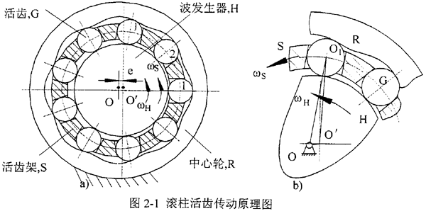 滾柱活齒傳動(dòng)系統(tǒng)(見(jiàn)圖2-la)主要由波發(fā)生器H、活齒G、活齒架S、中心輪R四個(gè)部分組成。如圖2-lb所示,滾柱活齒傳動(dòng)系統(tǒng)在工作時(shí),輸入驅(qū)動(dòng)力后,輸入軸以等角速度ωH,逆時(shí)針旋轉(zhuǎn),從而帶動(dòng)波發(fā)生器使其幾何中心O′繞旋轉(zhuǎn)中心O以同樣角速度旋轉(zhuǎn),波發(fā)生器半徑變化的輪廓曲線產(chǎn)生徑向推力,迫使與中心輪工作齒廓接觸的諸活齒,在沿活齒架徑向?qū)Р垡苿?dòng)的同時(shí),沿著中心輪工作齒廓滑滾,并通過(guò)活齒架的徑向?qū)Р弁苿?dòng)活齒架以勻速ωS逆時(shí)針轉(zhuǎn)動(dòng),于是滾柱活齒傳動(dòng)完成了輸入速度ωH、輸出速度ωS的轉(zhuǎn)速變換運(yùn)動(dòng)。而與中心輪非工作齒廓接觸的諸滾柱活齒,在活齒架徑向?qū)Р弁苿?dòng)下,順序地返回到導(dǎo)槽內(nèi)工作起始位置,從而分別完成了各自的運(yùn)動(dòng)循環(huán)。
