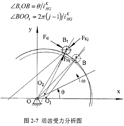 固定中心輪R,不失一般性,選擇活齒數(shù)ZG與中心輪齒數(shù)ZR之差為1。此時(shí)傳動(dòng)比大小等于活齒個(gè)數(shù)。假設(shè)開(kāi)始時(shí),波發(fā)生器的幾何中心O1在X軸上,該活齒中心在B點(diǎn),波發(fā)生器以角速度ω逆時(shí)針轉(zhuǎn)動(dòng)。t時(shí)刻時(shí),波發(fā)生器轉(zhuǎn)過(guò)θ角,該活齒中心運(yùn)動(dòng)到Bl點(diǎn),波發(fā)生器的幾何中心從Ol運(yùn)動(dòng)到O2;Fsj、FHj、FKj分別為活齒架、波發(fā)生器、中心輪對(duì)該滾柱活齒的法向壓力。