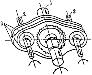 三環(huán)減速器是一種利用三相并列雙曲柄機(jī)構(gòu)來(lái)克服死點(diǎn)的連桿內(nèi)齒行星齒輪減速器,其基本結(jié)構(gòu)如圖5-0所示。它由低速輸出軸1 ,兩根高速輸入軸2 ,三片傳動(dòng)齒板3組成,各軸均平行配置,相同的兩根高速軸帶動(dòng)三片傳動(dòng)齒板呈120°相位差作平面轉(zhuǎn)動(dòng),傳動(dòng)環(huán)板上的內(nèi)齒圈與低速軸上的外齒輪相嚙合,形成大速比,其傳動(dòng)比