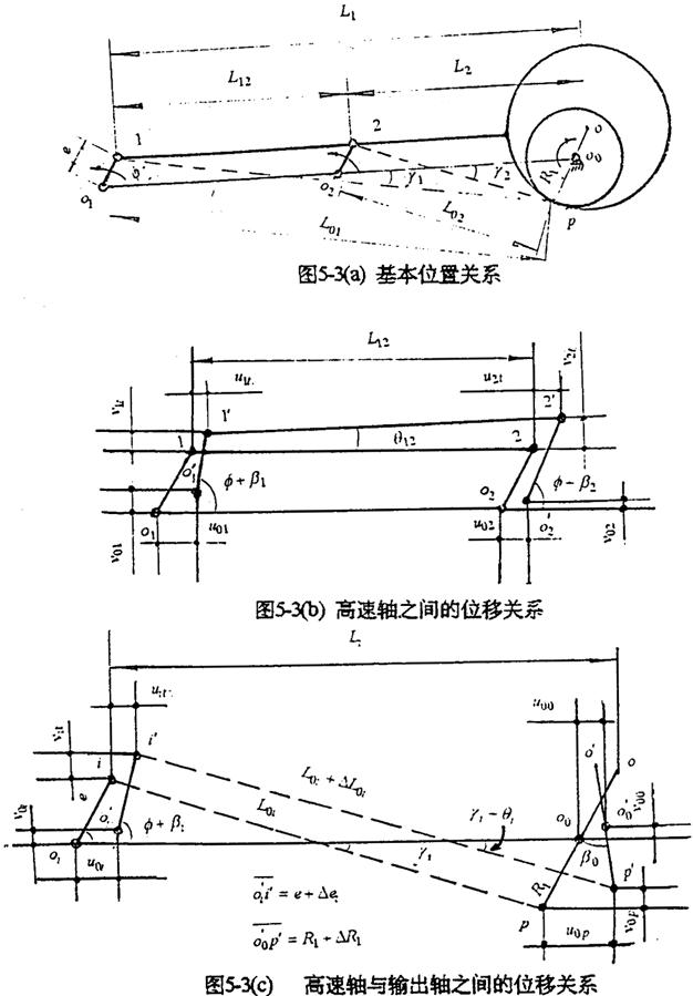 三環(huán)減速是多相并列連桿行星齒輪傳動(dòng)過(guò)約束機(jī)構(gòu)。應(yīng)該從整體系統(tǒng)上去考慮其變形關(guān)系。圖5-3是一相子機(jī)構(gòu)的位移關(guān)系圖。圖5-3(a)是基本位置圖、圖5-3(b)是高速軸之間的位移關(guān)系、圖5-3(c)是高速軸與輸出軸之間的位移關(guān)系(i=1、2)。由圖寫(xiě)出各運(yùn)動(dòng)副中心的位移關(guān)系如下: