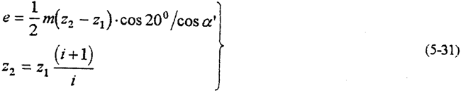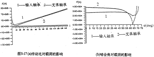由上式知,當齒數(shù)差Z2-Z1越小或傳動比i越大時,偏心距e越小;壓力角越大時,偏心距e越大,則選用的行星軸承尺寸大,齒板高速軸承孔徑也就大。圖5-17是傳動比、壓力角、以減速器行星軸承載荷的影響。由圖可見,傳動比的變化對減速器的動力性能影響極大;傳動比越大,則偏心距越小。由式(5-30)分析得,行星軸承載荷必須大。壓力角的變化,對行星軸承載荷影響小得多。