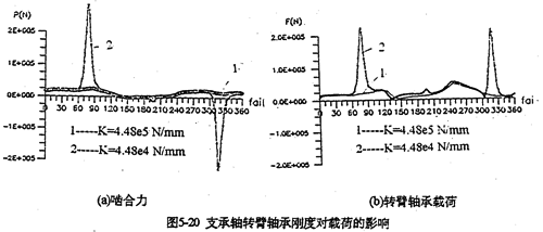 只考慮行星軸承變形及齒板變形時,影響三環(huán)減速器載荷特性的剛度,主要是行星軸承剛度、和內(nèi)齒圈的變形剛度。軸承剛度與軸承材料、間隙、油膜等很多因素有關。圖5-19是輸入軸行星軸承剛度對嚙合力及行星軸承載荷的影響。當輸入行星軸承剛度小一個數(shù)量級時,負向嚙合力區(qū)域增大(見圖5-19a);隨剛度減小、各相嚙合力越不均恒(圖5-19b),輸入軸行星軸承剛度的影響比輸入軸行星軸承剛度更大,見圖5-20所示。嚙合力及各行星軸承載荷在軸承剛度較小的情況時,都出現(xiàn)正常載荷的10倍以上的沖擊現(xiàn)象,沖擊產(chǎn)生的位置隨剛度變化不同。內(nèi)齒圈剛度對載荷的影響與行星軸承剛度相反(見圖5-21所錄)。當剛度越小時,三相齒板的嚙合力越均恒(見圖5-21a),而且行星軸承載荷幅值基本上不變(見圖5-21b)。同此可推知,減小三環(huán)減速器振動的途徑之一就是提高行星軸承剛度,減小內(nèi)齒圈剛度。這可以通過對行星軸承進行預緊,和采用軟齒面或大柔度齒圈的辦法,以使嚙合力和行星軸承載荷均衡化,以達到減振降噪的目的。