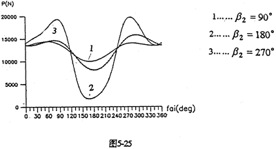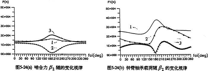 當輸入軸與軸出軸的中心距確定后,可通過調(diào)整支承軸的位置,滿足特殊的空間位置要求,或者設計成載荷分布特性最優(yōu)、幅值最小的減速器。圖5-24是中心距L1=400mm、L2=200mm時,支承軸相對于輸出軸轉(zhuǎn)動的角位移β2變化時嚙合力及行星軸承載荷的分布情況。由圖看出,各種載荷均在180°附近(SHQ偏置式減速器)取得極大值。在0°~90°和270°~360°范圍(Ⅰ、Ⅳ限內(nèi)),三相齒板嚙合力分配很均衡,嚙合沖擊很小。因此。設計三環(huán)減速器時,為減小載荷的幅值和各相之間載荷的差值、支承軸應盡可能遠離180°,即不采用三軸心共線的水平位置的結(jié)構(gòu)。圖5-25為幾個特殊位置的嚙合力隨轉(zhuǎn)角變化的分布規(guī)律。