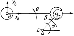 上式中,(xb,yb)是B處的位移量,θ為連桿繞鉸點(diǎn)的轉(zhuǎn)角位移,β為接觸點(diǎn)C在從動(dòng)曲柄軸上繞軸線(D)的轉(zhuǎn)角位移,L為連桿的長度,見圖3.2。