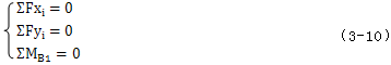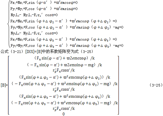 根據(jù)公式(3-9),每個(gè)環(huán)板可建立4個(gè)方程,那么n個(gè)環(huán)板可建立的方程總數(shù)為4n,式中位移量xbi,ybi,θi和β都是未知量,其總數(shù)為3n+1,故能提供的補(bǔ)充方程數(shù)為4n+3n-1=n-1個(gè),同機(jī)構(gòu)所包含的虛約束個(gè)數(shù)相等,聯(lián)立式(3-10)、(3-11)、(3-9)可解得全部未知量。為了簡化計(jì)算過程,可以利用結(jié)構(gòu)力學(xué)中求解靜定結(jié)構(gòu)的位移計(jì)不,即把式(3-9)代入式(3-10)中,得到以連桿參數(shù)點(diǎn)位移xbi,ybi,θi和曲柄位移β為未知量的3n個(gè)方程,再由式(3-11)得到位移變形量Bxi,Byi,θi, β為未知量的3n+1個(gè)方程,并從中解得各位移變量,然后代入式(3-11)、(3-9)中可求得機(jī)構(gòu)各運(yùn)動(dòng)副反力及力矩。