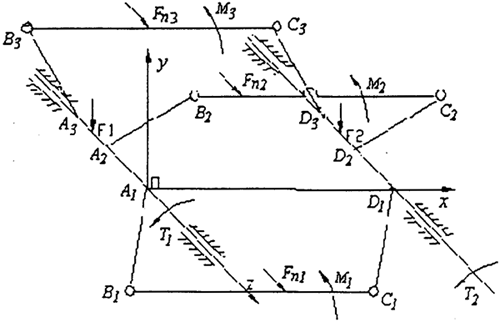 共可列出10個(gè)方程,聯(lián)立式(3-10)或(3-11),對于多相并列雙曲柄結(jié)構(gòu),用一般靜態(tài)力學(xué)分析方法,可列出3n+10個(gè)方程,而未知量的總數(shù)為4n+9(運(yùn)動(dòng)副反力和輸入力矩),故機(jī)構(gòu)中未知量,(n-1)正是機(jī)構(gòu)中的虛約束個(gè)數(shù),為了得到補(bǔ)充方程,必須考慮構(gòu)件的變形協(xié)調(diào)要求。
