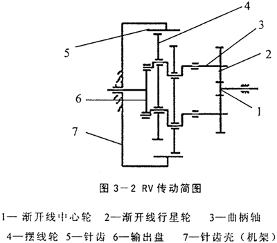 圖3-2是RV傳動簡圖。它由漸開線圓柱齒傳輸線行星減速機構和擺線針輪行星減速機構兩部分組成。漸開線行星齒輪3與曲柄軸2連成一體,作為擺線針輪傳動部分的輸入。如果漸開線中心齒輪1順時針方向旋轉,那么漸開線行星齒輪在公轉的同時還有逆時針方向自轉,并通過曲柄帶動擺線輪作偏心運動,此時擺線輪在其軸線公轉的同時,還將在針齒的作用下反向自轉,即順時針轉動。同時通過曲柄軸將擺線輪的轉動等速傳給輸出機構。