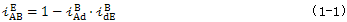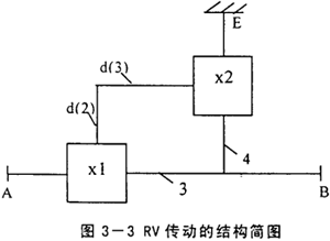 為計算RV傳動的傳動比,將上述的傳動簡圖用圖3-3所示的結構簡圖代替。該機構簡圖包括兩個簡單行星機構:x1和x2。輸出件A為中心輪1,輸出件B為輸出盤6,且有ω6=ω4。支承件E為針輪7,漸開線行星輪2與轉臂(曲柄軸)3均為輔助件d。