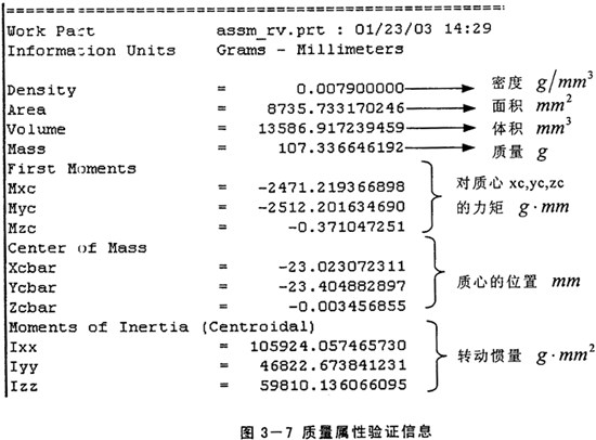 通過UG強大的質量屬性檢驗功能,可獲得每個零件及整個模型的密度、體積、質量和慣量等必要信息。上圖3-7是所獲得的擺線輪的相關信息。