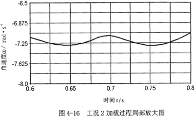 以上兩組數(shù)據(jù)分析表明,加載時,經(jīng)柔性速度補償裝置速度補償后的速度輸出,在加載的時段,速度波動明顯減小,具體數(shù)值可參看其局部放大圖,另外,阻力矩和電機的主動力距和加柔性速度補償裝置前數(shù)值大小沒有明顯變化,表明對原機械系統(tǒng)的電機和其它動力、強度等一些性能參數(shù)沒有大的影響。