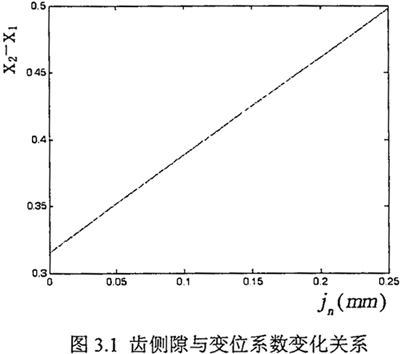 由3.2圖可以看出,當齒側隙jn由0變化至.25毫米時(查資料取較大最小側隙參考值),齒輪變位系數(shù)差X2-X1的變化量由近0.32變化到0.50,變化了約0.18。
