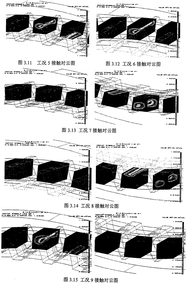 由表3.2~3.13可以看出,無論有無制造、安裝誤差的影響,隨著負荷的增加,齒輪實際嚙合接觸對數(shù)增加,但從計算結果分析證明,負荷對接觸對的影響小于誤差對接觸對的影響。對比表中的接觸對數(shù)和接觸應力,數(shù)據(jù)表明當齒厚發(fā)生變化時,實際接觸齒對數(shù)變化比較大,同時最大接觸應力也有明顯變化。從變化的趨勢上看出與前面的理論推導變化趨勢相同,這里只是更加明顯。