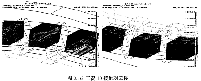 工況六至工況十這四和情況,是指兩環(huán)板之間不對稱,即偏心軸的兩個偏心拐的尺寸誤差不一致,這里考慮的是特殊狀況,從表3.10-3.13看出,當兩環(huán)板不對稱時,將產生嚴重的載荷不均現(xiàn)象,載荷偏向中心距小的環(huán)板內齒上,甚至只有一個環(huán)板承受載荷。由此說明,對于雙環(huán)減速器偏心軸有加工,應特別注意兩曲捌的制造誤差,應盡量使安裝好的兩環(huán)板具有較好的對稱性。圖3.7~圖3.12為六種工況下環(huán)板內齒的接觸齒對的應力云圖。