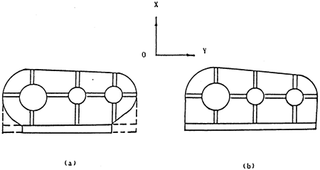 現(xiàn)在三環(huán)減速器箱體結(jié)構(gòu)一般參照通用減速器箱體結(jié)構(gòu)來(lái)設(shè)計(jì)的,如圖6-4(a)(b)和圖3-1示,這種結(jié)構(gòu)的y向剛度較小,為了增加y向剛度,應(yīng)設(shè)計(jì)成圖7-2(b)示形狀,顯然,圖7-2(b)的結(jié)構(gòu)剛度比圖7-2(a)結(jié)構(gòu)大。