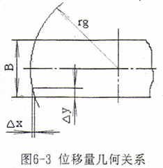 位移傳感器根據(jù)運動的型式不同分為直線位移傳感器和角度位移傳感器,直線位移傳感器常見的有光柵位移傳感器、感應(yīng)同步傳感器等,它們可以直接安裝在所測直線運動部件上,無傳動誤差影響,精度高。但是由于結(jié)構(gòu)的原因,它們需要非常精確的安裝基準(zhǔn)和合適的安裝空間,且通常情況下安裝定位較困難。由于光柵的密封性較差,光柵材料較脆弱,所以它們的抗污染性能和抗振性能也較差,而且所需防護裝置也較復(fù)雜,成本較高。角度位移傳感器最常用的有光電編碼器,它具有精度高,體積小,安裝方便、密封性好、抗污染和抗振性能好等優(yōu)點。本設(shè)計需測刀架的位移,在刀架上,切削冷卻潤滑油、切屑及粉塵的飛濺較嚴(yán)重,且不易設(shè)置防護裝置。如果采用光電編碼器需通過檢測絲桿的角位移間接檢測刀架的直線位移,但絲桿及傳動機構(gòu)具有的傳動精度和位移檢測精度是足夠的。另外,加工鼓形齒輪時,形成鼓度曲線的實際切削位置通常在曲線較陡的范圍,例如加工圓弧鼓度曲線,幾何關(guān)系見圖6-3,設(shè)位移圓半徑rg=300mm,齒寬B=50mm,當(dāng)Δy=0.01mm,則