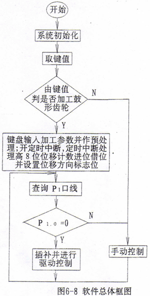 非圓弧曲線插補運算時,首先根據(jù)當(dāng)前的Y坐標(biāo)值及插補曲線f(x,y)=0,求解出x坐標(biāo)理論值xt,設(shè)當(dāng)前的實際x坐標(biāo)為xr,令誤差函數(shù)F=xr-xt。對圓弧曲線,根據(jù)當(dāng)前的x、y坐標(biāo),計算x2+y2值,令誤差函數(shù)F=x2+y2-R2。根據(jù)當(dāng)前點在不同象限、當(dāng)前刀架的運動方向及誤差函數(shù)的正負(fù),共有8種情況出現(xiàn)(如圖6-10所示),應(yīng)根據(jù)它們的狀態(tài)進行不同的處理。①、⑥兩種情況應(yīng)使當(dāng)前點向x坐標(biāo)負(fù)方向走步;③、⑦兩種情況應(yīng)使當(dāng)前點向x坐標(biāo)正方向走步;②、④、⑤、⑧四種情況無需在x坐標(biāo)方向走步。由于在切齒過程中刀架的進給速度較低,最高一般不超過30毫米/分鐘,兩次y坐標(biāo)計數(shù)脈沖間隔時間可達幾十毫秒,而插補運算的時間不超過1毫秒,因此插補速度足夠。在刀架快速運動時,插補有滯后,但此時不切削,這種滯后不影響加工。在插補過程中,顯示器輪流顯示當(dāng)前的x、y坐標(biāo)值,以利于操作者監(jiān)視加工情況,因此還需進行顯示BCD碼的轉(zhuǎn)換和輪換的控制。插補運算及驅(qū)動控制程序框圖見圖6-11。