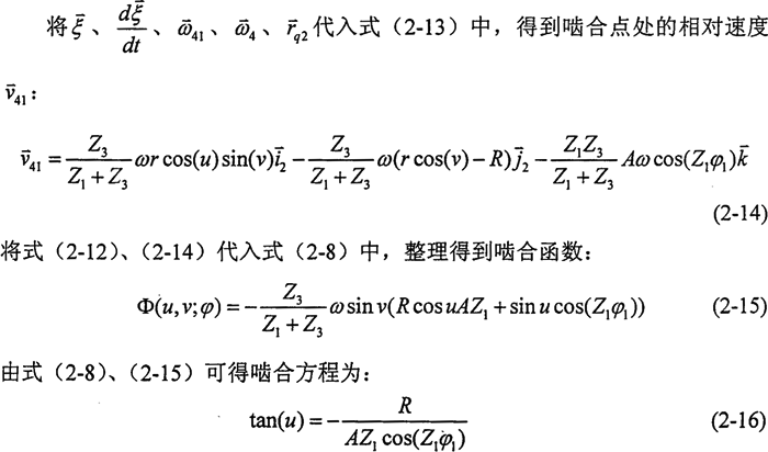 將活齒齒面方程(2-8)的坐標轉(zhuǎn)換到σ1上,并與嚙合方程(2-16)聯(lián)立,即可得到主動軸齒面∑1的方程,即