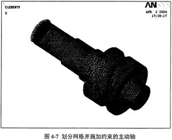 四面體單元每個節(jié)點有三個自由度(Tx,Ty,Tz),通過限制節(jié)點的自由度,對模型施加約束。模擬軸承的作用,在安裝軸承處的零件表面施加約束,首先將表面上所有節(jié)點的坐標(biāo)由笛卡爾坐標(biāo)(x,y,z)轉(zhuǎn)換為柱坐標(biāo)(R,θ,Z),然后限制自由度R。并在主動軸的輸入軸端面和導(dǎo)架的輸出軸端面,限制所有節(jié)點的自由度。劃分網(wǎng)格并施加約束的主動軸見圖4-7。