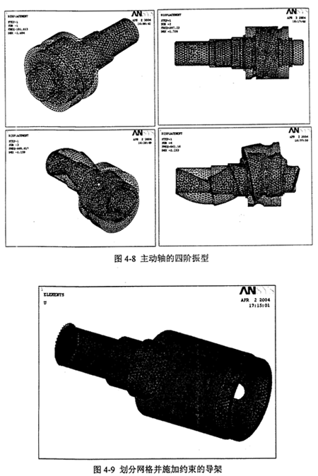 選擇Subspace特征值求解器,指定擴(kuò)展模態(tài)數(shù)為4,頻率范圍為0~1000Hz。求得輸入軸的前四階固有頻率為101.SHz、207.2Hz、660.6Hz、661.2Hz,對應(yīng)的振型見圖4-8。一階振型為繞z軸扭轉(zhuǎn),二階振型為沿z軸軸向拉伸,三階振型為在xoz平面彎曲,四階振型為在yoz平面彎曲。