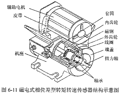 圖6-11為磁電式相位差型轉(zhuǎn)矩轉(zhuǎn)速傳感器的結構示意圖,它由機座、端蓋、扭力軸、內(nèi)齒輪、外齒輪、磁鋼、線圈軸承等組成。內(nèi)齒輪、磁鋼固定在套筒上,線圈固定在端蓋上,外齒輪固定在扭力軸上,當內(nèi)外齒輪發(fā)生相對轉(zhuǎn)動時,由于磁通不斷變化,在線圈中便感應出近似正弦波的感應電勢ul、u2,兩感應電勢的初始相位差是恒定的,考慮到正反加載,φ0設計在大約180°位置上,當加上扭力時,扭力軸發(fā)生扭轉(zhuǎn)變形,在彈性范圍內(nèi)外加扭矩與機械扭轉(zhuǎn)角成正比,這時ul、u2訊號的相位差要發(fā)生變化,即