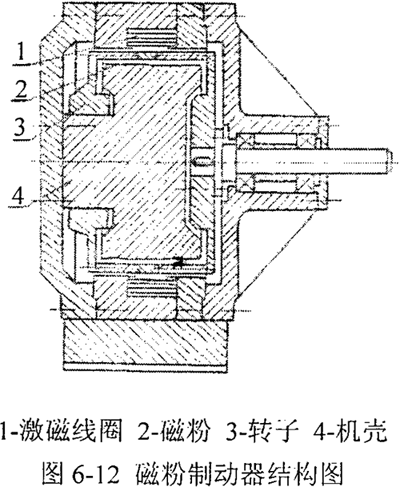 采用磁粉制動器作為試驗的加載裝置。磁粉制動器由轉(zhuǎn)子、機殼、激磁線圈、磁粉組成,其結構如圖6-12所示。在激磁線圈不通電流時,不產(chǎn)生磁通,磁粉呈自由狀態(tài)。當軸轉(zhuǎn)動時,由于離心力的作用,使磁粉散布在轉(zhuǎn)動件與機殼之間,若此時激磁線圈通電流,則在線圈周圍產(chǎn)生磁場,轉(zhuǎn)動件與機殼間的磁粉沿磁通方向連接成鏈狀,由于磁粉間的結合力,使工作面之間產(chǎn)生摩擦力,從而形成制動力矩,起到加載的作用。該力矩與激磁電流的大小基本成正比,故通過調(diào)節(jié)激磁線圈的電流大小可在一定范圍內(nèi)改變制動力矩的大小。