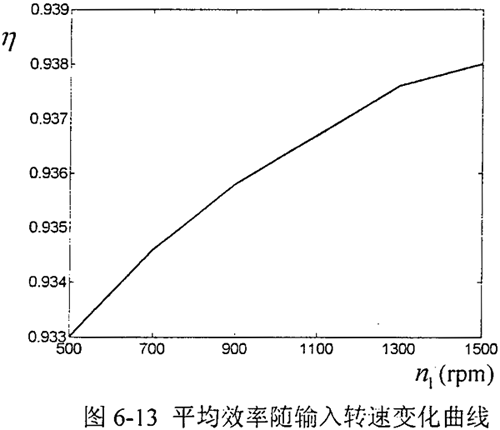 進行減速器效率試驗前,首先讓減速器在輸入轉(zhuǎn)速為500rpm的條件下,空載跑合4個小時,觀察運轉(zhuǎn)正常后,進入試驗的準備階段。為測得準確試驗數(shù)據(jù)必項對轉(zhuǎn)矩轉(zhuǎn)速測量儀進行常數(shù)輸入和轉(zhuǎn)矩調(diào)零設置,一切準備完畢后,開始對減速器進行試驗測試。當輸入軸轉(zhuǎn)速取不同值時計算出減速器樣機的傳動比及樣機總評傳動比如表6-1所示,通過分析測試數(shù)據(jù)可知,經(jīng)實測最大的傳動比誤差為-0.0148,平均傳動比誤差為-0.0078。表明樣機的傳動比準確,傳動精度高。經(jīng)分析可知,正弦滾道的加工精度是造成整機傳動誤差的主要原因。
