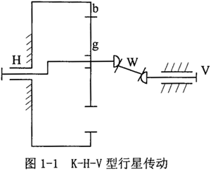本文所研制的兩級三環(huán)減速器屬漸開線少齒差傳動(dòng)形式,有必要重點(diǎn)討論一下漸開線少齒差行星齒輪傳動(dòng)。當(dāng)漸開線內(nèi)嚙合圓柱齒輪副的內(nèi)齒輪和外齒輪齒數(shù)差很少時(shí)(一般為1~4個(gè))所組成的行星齒輪機(jī)構(gòu),稱為少齒差行星齒輪傳動(dòng)。如圖1-l所示的K-H-V型(也稱N型)是其主要形式,K-H-V型傳動(dòng),其內(nèi)齒圈b固定,轉(zhuǎn)臂H是輸入軸。由于它的轉(zhuǎn)動(dòng)和內(nèi)齒圈的限制,行星輪g作平面運(yùn)動(dòng),即行星輪既繞內(nèi)齒圈軸線作圓周平移運(yùn)動(dòng),又繞自身軸線作回轉(zhuǎn)運(yùn)動(dòng),再用輸出機(jī)構(gòu)W把行星輪的回轉(zhuǎn)運(yùn)動(dòng)傳遞給輸出軸,從而起到減速作用。