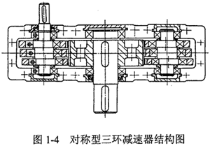盡管我國在三環(huán)減速器的研究方面取得了許多令人矚目的成果,但由于三環(huán)減速器的研發(fā)時(shí)間較短,對有些問題研究的還不夠深入,生產(chǎn)中存在的一些實(shí)際問題還未從根本上得到解決,制約了這種新裝置的推廣使用。我國開發(fā)的三環(huán)減速器的基本型結(jié)構(gòu)主要有兩種,一是兩高速軸對稱布置于輸出軸兩側(cè)的對稱型三環(huán)減速器,如圖1-4所示,另一種是兩高速軸布置于輸出軸同側(cè)的偏置型三環(huán)減速器。